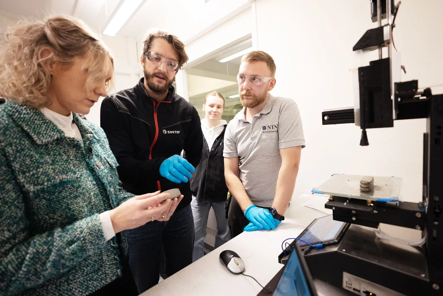 SCENE-B researcher Andrei participated and shared expert knowledge in a demonstration of NTNU's 3D printer for cement paste to assess printability of the cementitious systems. Also present at the demonstration were the Norwegian Minister for Digitalisation and Public Governance, Karianne Oldernes Tung, and Statsbygg’s Director of Digitalisation and Development, Cathrine Mørch.